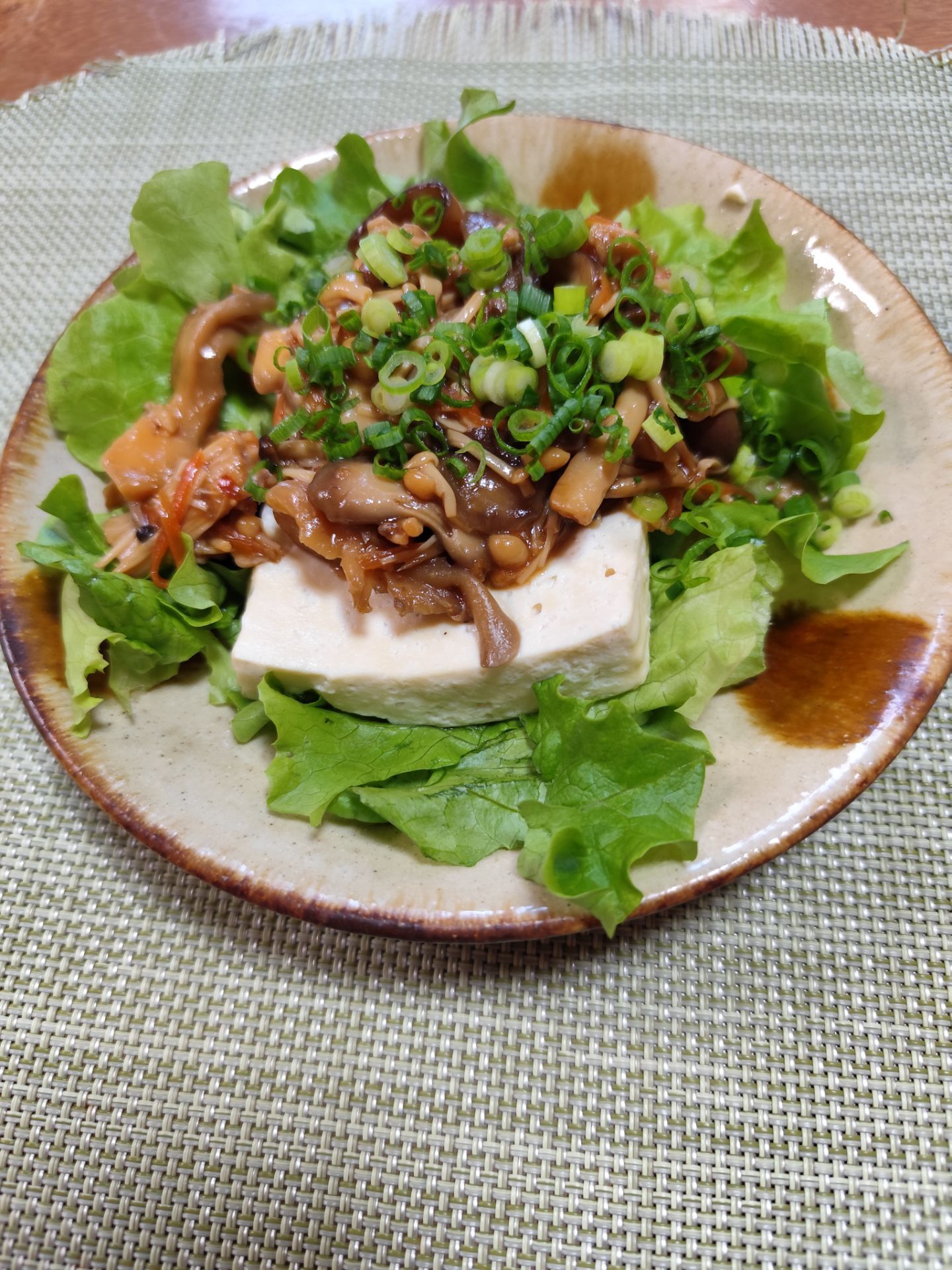豆腐は5等分にカットして蒸す。生シイタケは薄切りにして、しめじはほぐす。えのきは3センチの長さに切る。にんにくはみじん切りにする。青ネギは小口切りにする。レタス類は一口大に切る。