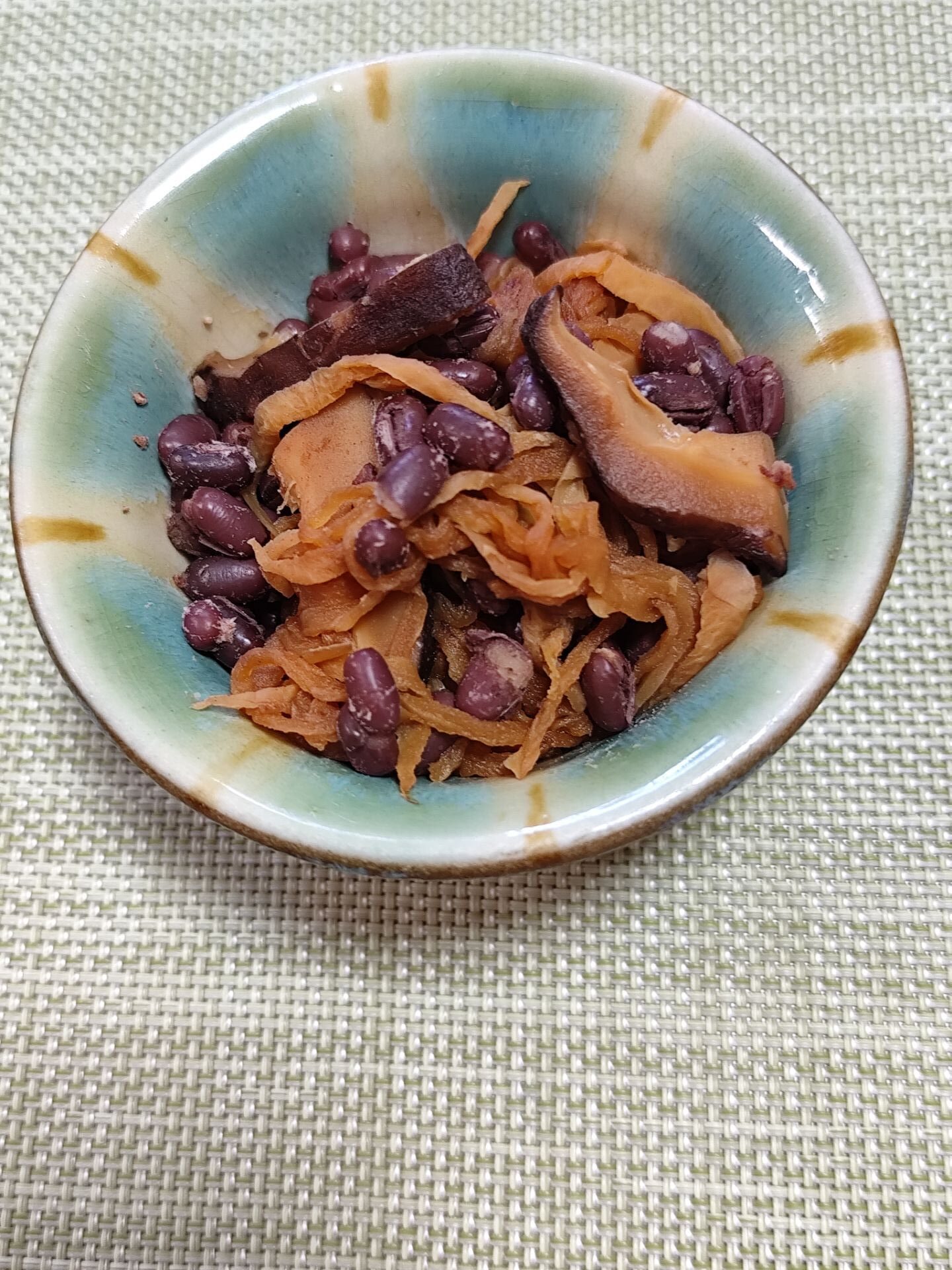 干ししいたけは水で戻し千切りにする。切干大根はさっと洗い、ひたひたの水で戻す。どちらも戻し汁ごと鍋に入れ火にかける。だし汁も加え、柔らかくなるまで煮たら醤油とみりんを加え、煮汁が少なくなるまで煮る。