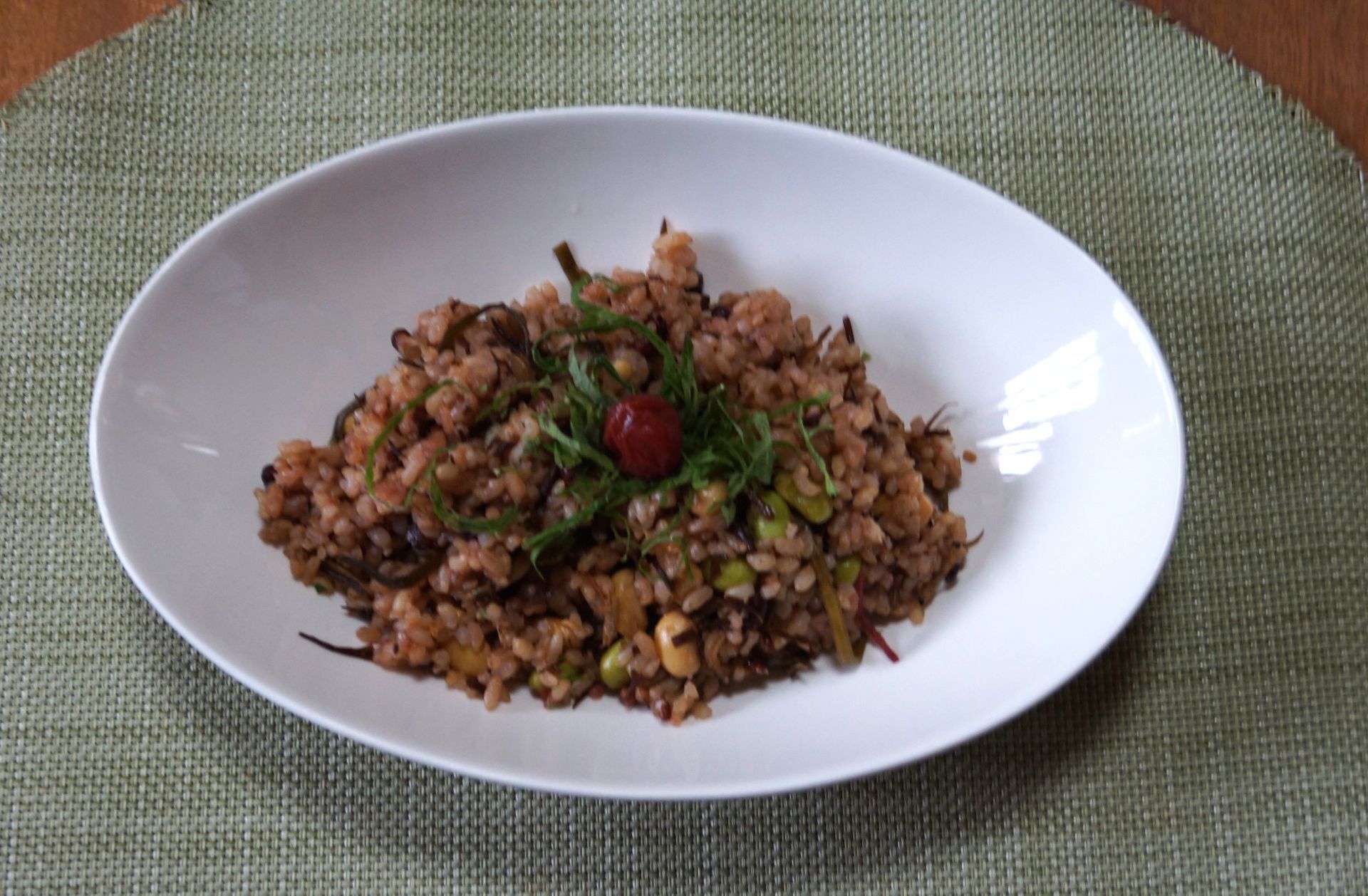 炊いた玄米にひじきと豆類、刻み昆布といかなごと梅干を加え、混ぜ合わせる。味が薄ければ醤油や塩などで調味する。