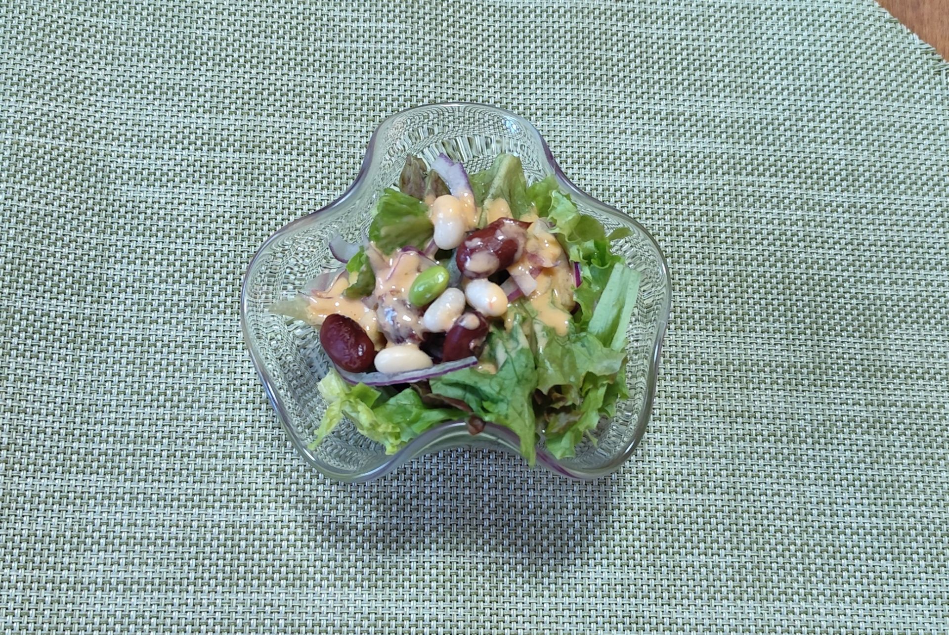 紫玉ねぎは薄切りにして水にさらす。レタスは一口大にちぎる。豆苗は2センチの長さに切る。冷凍ミックスビーンズはさっと茹でて水気を切る。