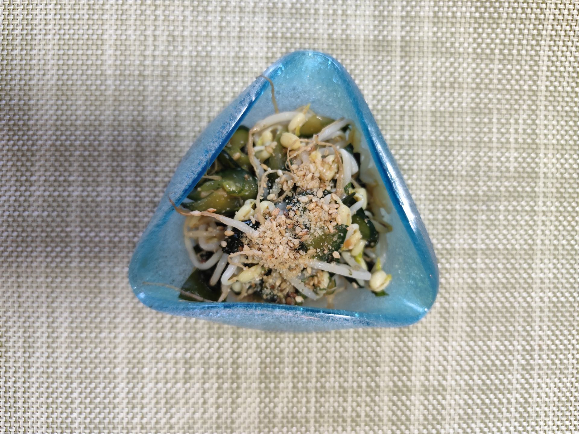 ❷に❶のもやし・ワカメ・きゅうりを水気を絞って加え、大葉も入れてさっくりと和える。