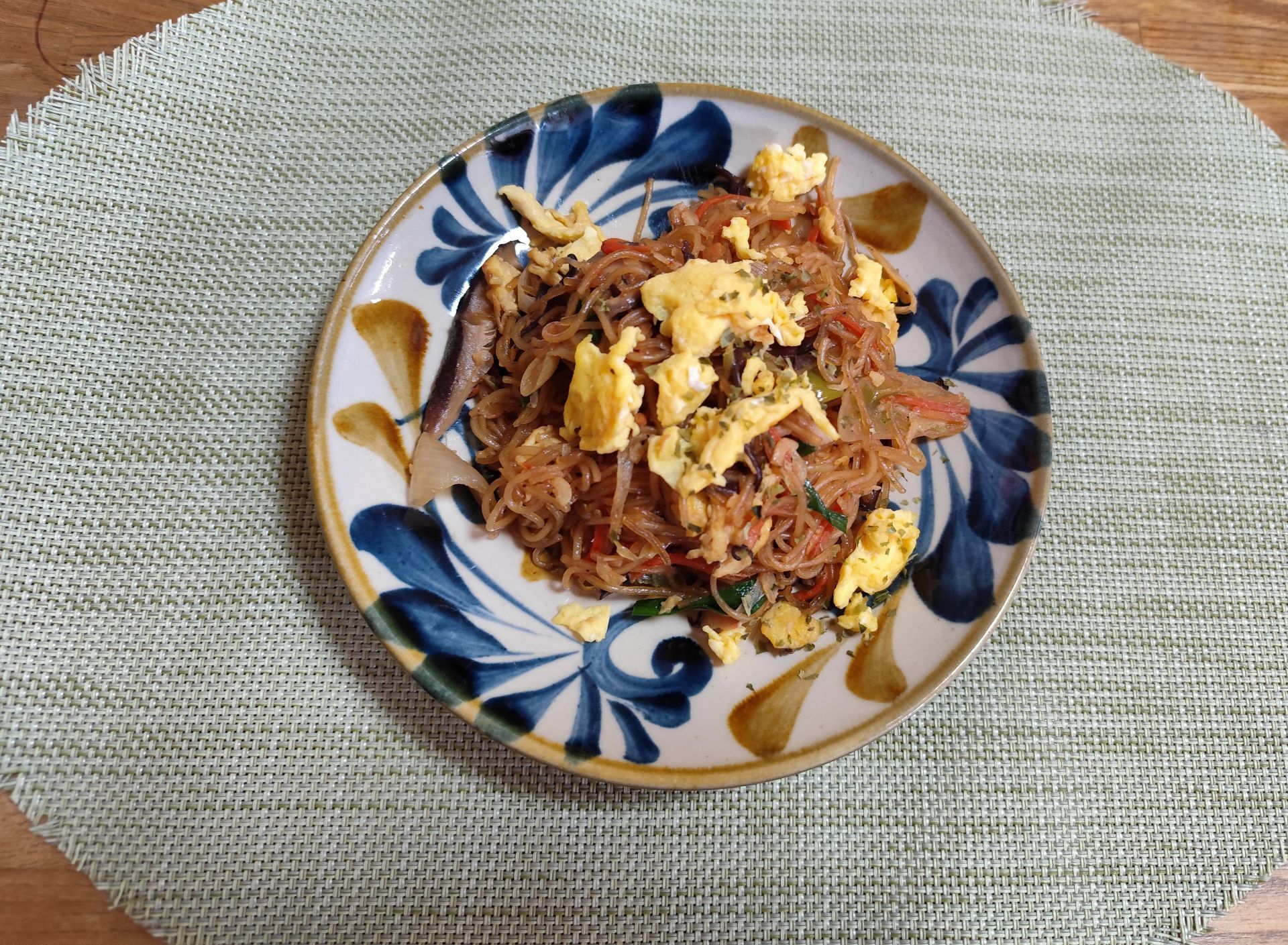 鍋にごま油とにんにく生姜を入れ火にかける。香りが立ったらニラ以外の野菜ときくらげ、桜エビを炒める。野菜がしんなりとしてきたら、軽く塩コショウをふり、春雨とだし汁・醤油・甘酒・コチュジャンを加える。