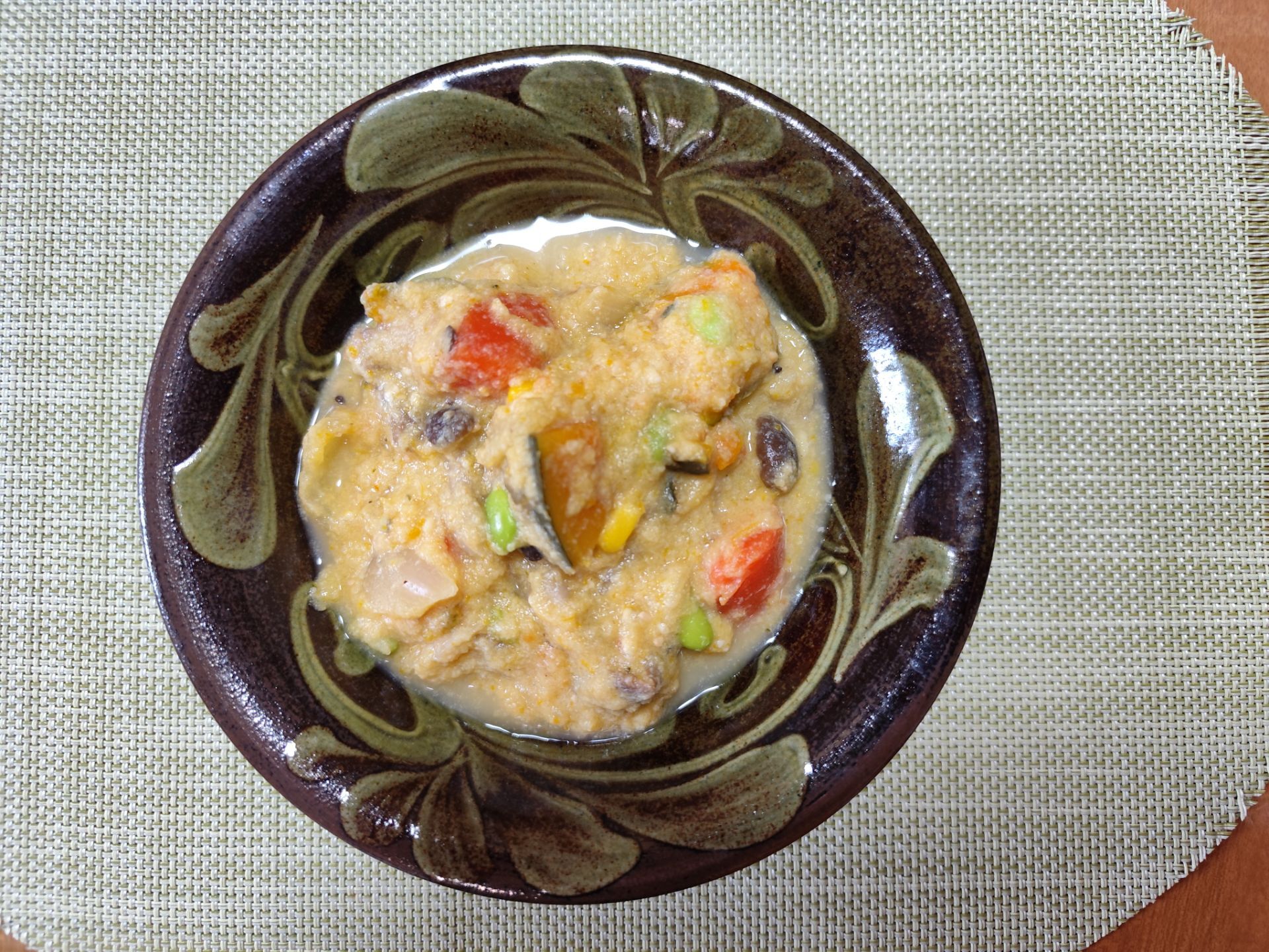 野菜が柔らかくなったら、なべ底からかき混ぜ、豆乳を加える。水分が足りない場合は水を加えて調整する。ミックスビーンズと味噌・塩コショウも加え、ひと煮立ちして味を調えたら出来上がり。