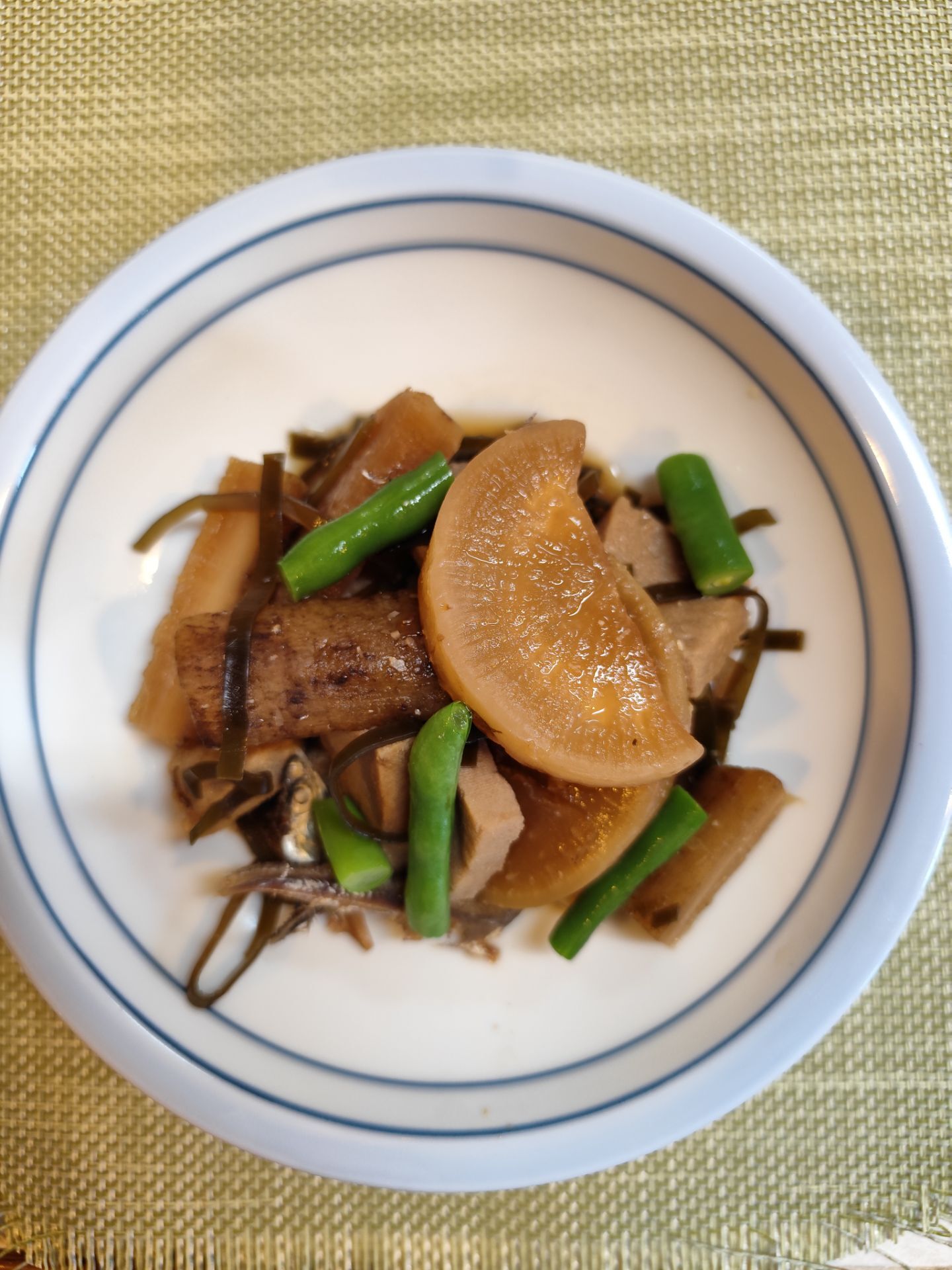 高野豆腐と昆布は水で戻す。 大根は厚めの半月切りにして下茹でする。インゲンは4~5㎝の長さに切り下茹でする。