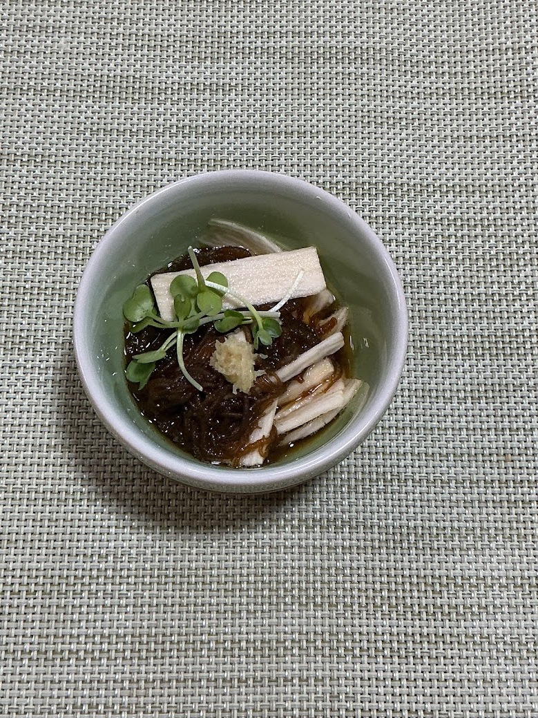 もずくは流水で洗い、塩抜きして食べやすい長さに切る。長芋は千切りにして変色防止のため少量の酢を混ぜておく。生姜はすりおろす。