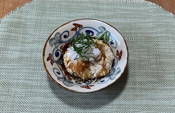 ❶の木綿豆腐と玉ねぎ、片栗粉・塩コショウ・米ぬかを混ぜ合わせハンバーグ形にまとめ、蒸気のあがった蒸し器で10分程蒸す。