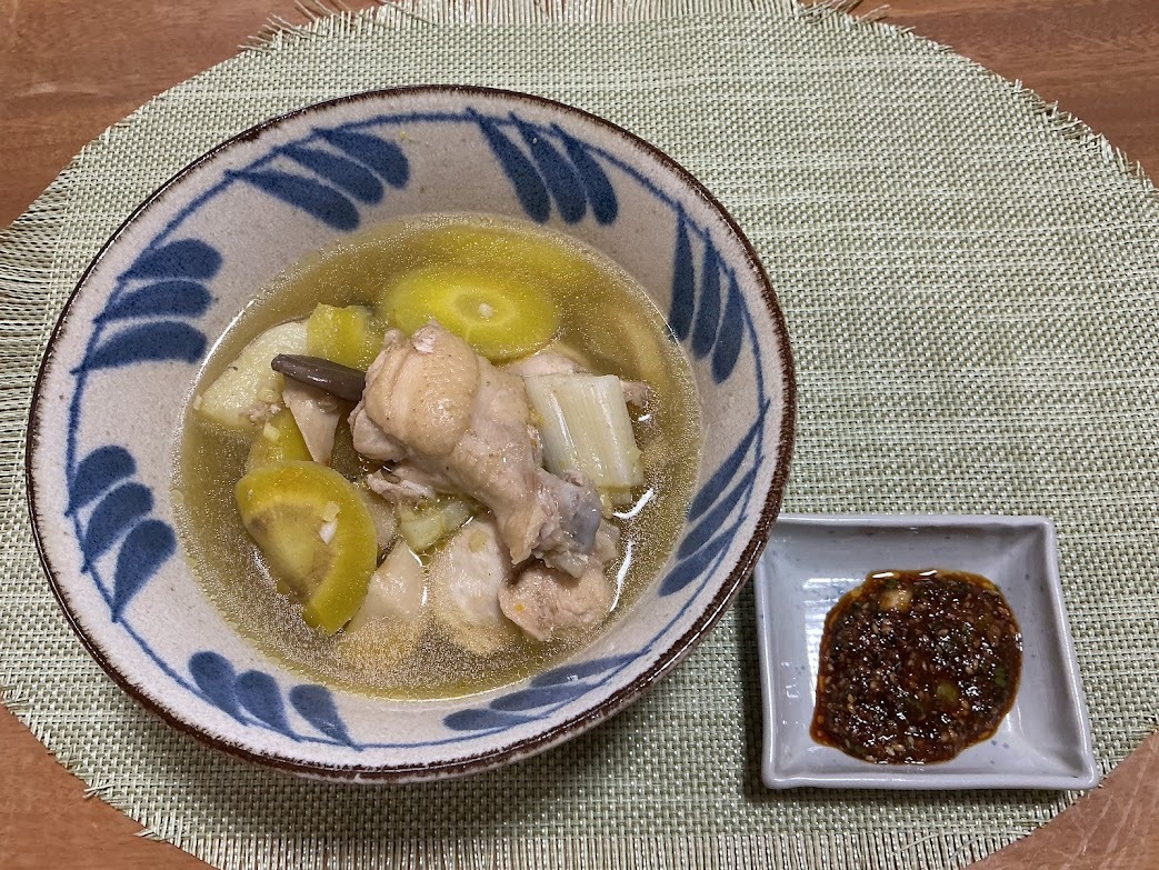 鍋に鶏肉、にんにく・生姜・長ネギ・水を入れて火にかけ、煮立ったらアクをとり、酒と塩を加えて蓋をして弱火で15分程煮る。