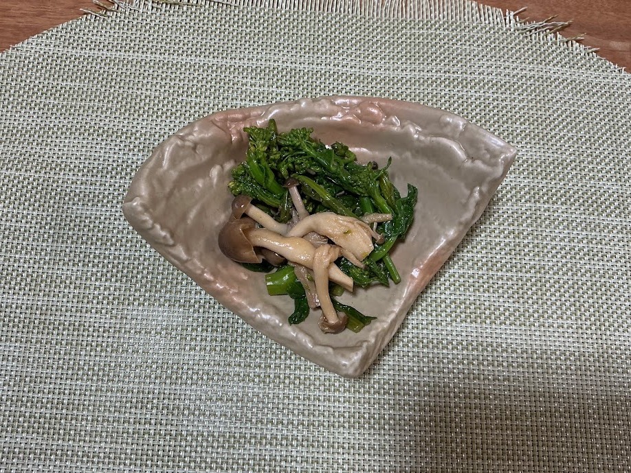菜の花は4センチの長さに切り茹でて水にさらし固く絞る。しめじはほぐして茹でてザルにあげ冷ましておく。