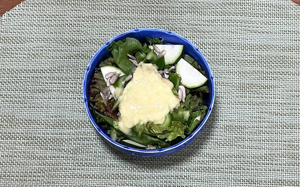玉ねぎをざく切りにして、全ての調味料とミキサーに入れ攪拌してドレッシングを作る。