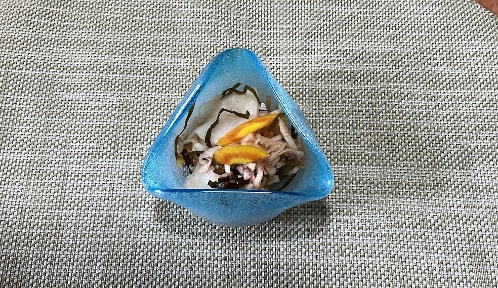 切干大根はさっと洗いハサミでカットしたら刻み昆布と一緒に分量の水でもどす。かぶはいちょう切りにして塩込みする。ラディッシュは薄切りにして塩もみする。