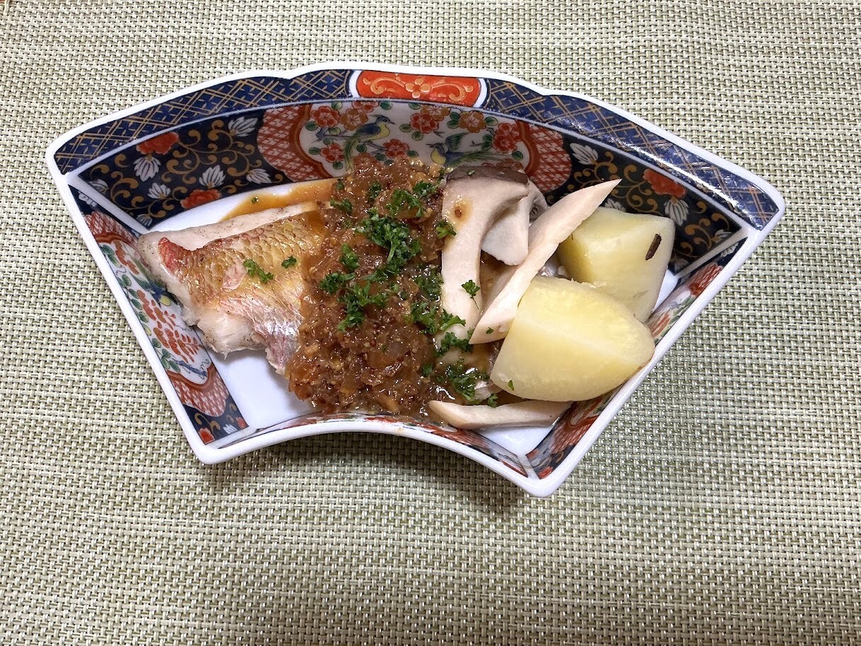 魚は余分な水分を拭き取り、蒸し器で蒸す。じゃがいもとエリンギはお好みにカットして蒸しておく。玉ねぎとニンニクはみじん切りにする。パセリはみじん切りにする。