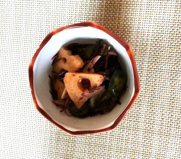 ひじきは水で戻す。ひじきはさっと茹でる。レンコンはいちょう切りにしてさっと茹でる。玉ねぎは薄切りにして水にさらす。きゅうりは輪切りにして塩もみする。
