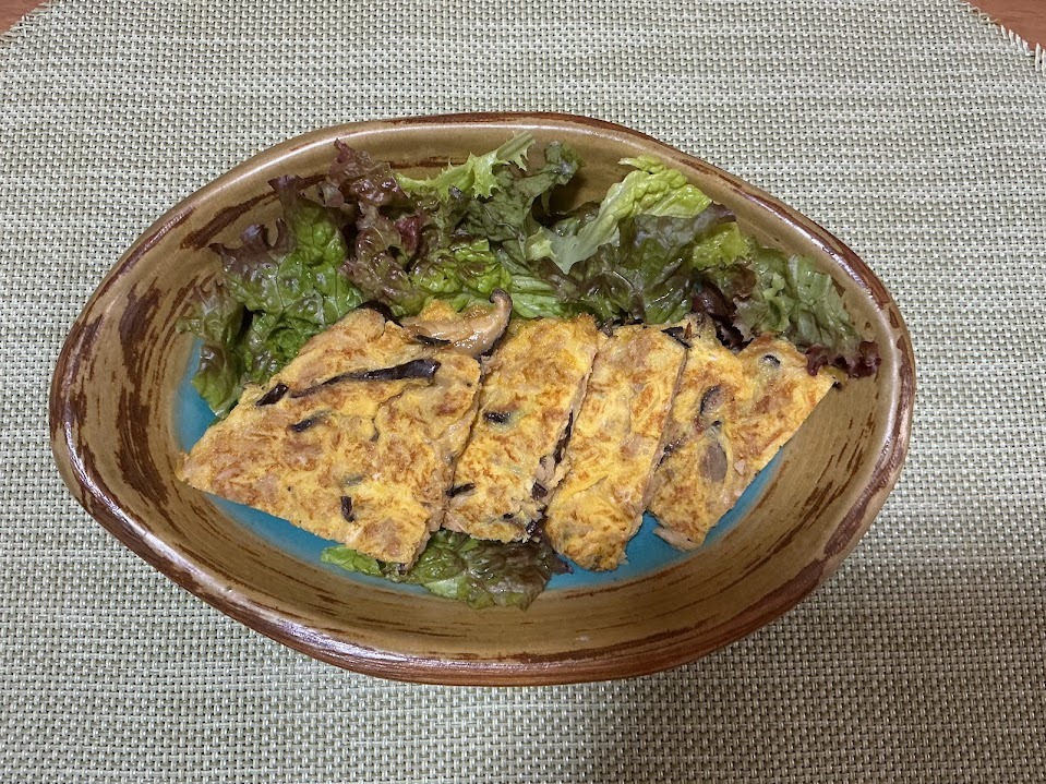 ➂のフライパンにごま油を足し、➁を流し入れて全体を大きく混ぜ、1~2分焼く。焼き色がついたら返し、もう片面も1分程焼いたら出来上がり。レタスを敷いた器に盛りつける。