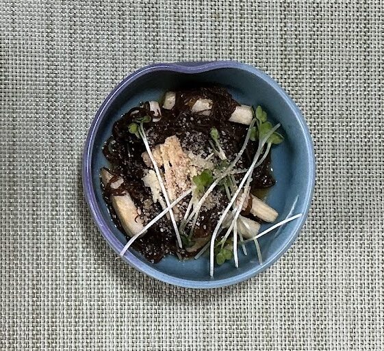 山芋と生姜は千切りにする。もずくは流水で洗い、塩抜きする。山芋は変色防止のため、カットしたら少量の酢を混ぜておく。