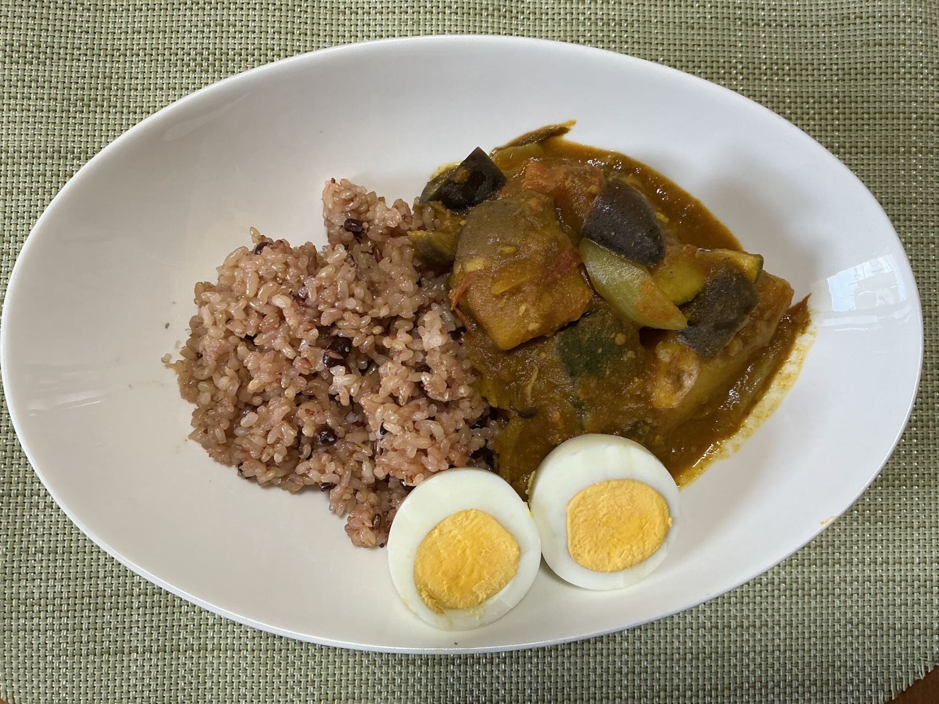 鍋で油とにんにく生姜を炒め香りを出す。玉ねぎ・なす・しめじ・エリンギ・ズッキーニ・塩コショウを入れ、しばらく炒めたら、蓋をして弱火で10分程蒸し焼きにする。ゆで卵を作る。
