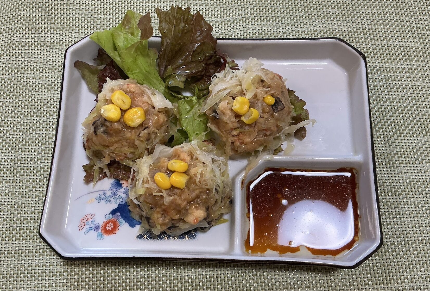ボールにエビ・エリンギ・玉ねぎ・Aを混ぜ合わせる。一口大に丸めたタネにキャベツをまぶすように包む。上に飾用のコーンをのせて蒸す。
