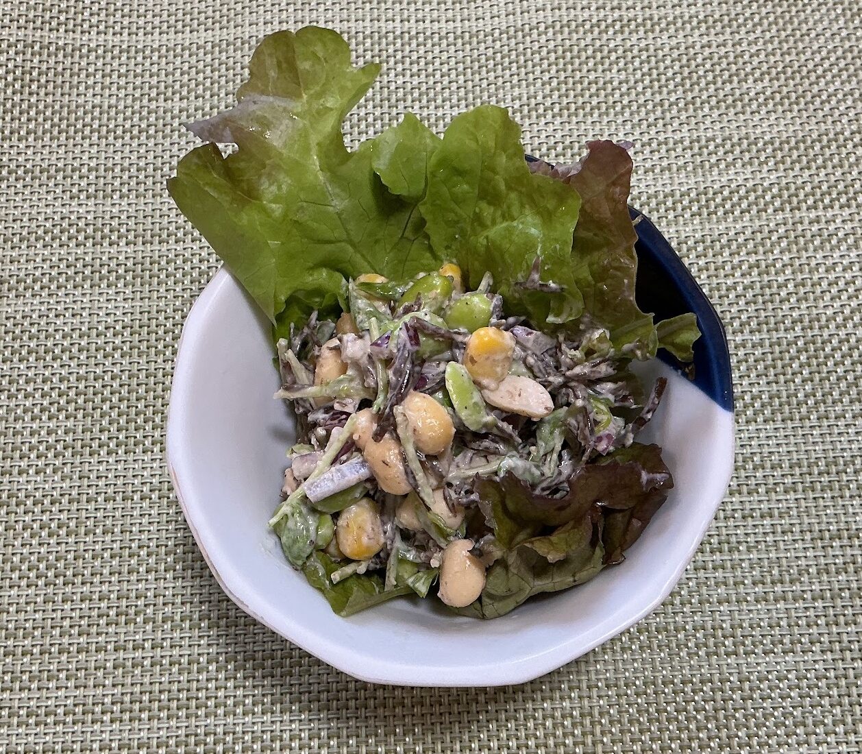 ミックスビーンズはさっと茹でる。ひじきは水で戻してさっと茹でる。玉ねぎは水にさらす。