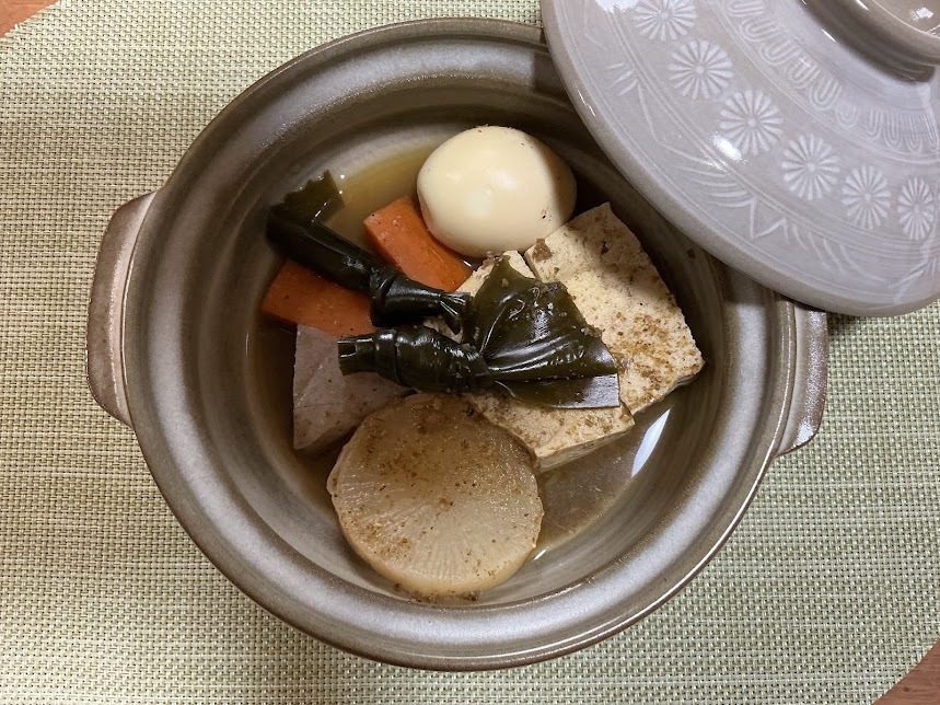 大根、人参はお好み、板こんにゃくは三角、冷凍豆腐は食べやすくカットし、昆布は結日ます。こんにゃくは下茹でしておく。冷凍豆腐は絞っておく。ゆで卵を作る。