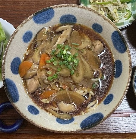 鶏もも肉は一口大、ごぼう、長ネギは斜め薄切り、人参、大根はいちょう切り、干ししいたけは千切り、青ネギは小口切りにカットします。干しシイタケは水でもどす。鶏肉は皮をとる。こんにゃくは下茹でする。