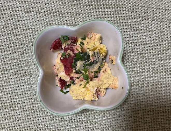 ビーツはいちょう切り、パセリはみじん切り、おからは蒸しておく。ジャガイモは茹で、熱いうちにつぶす。