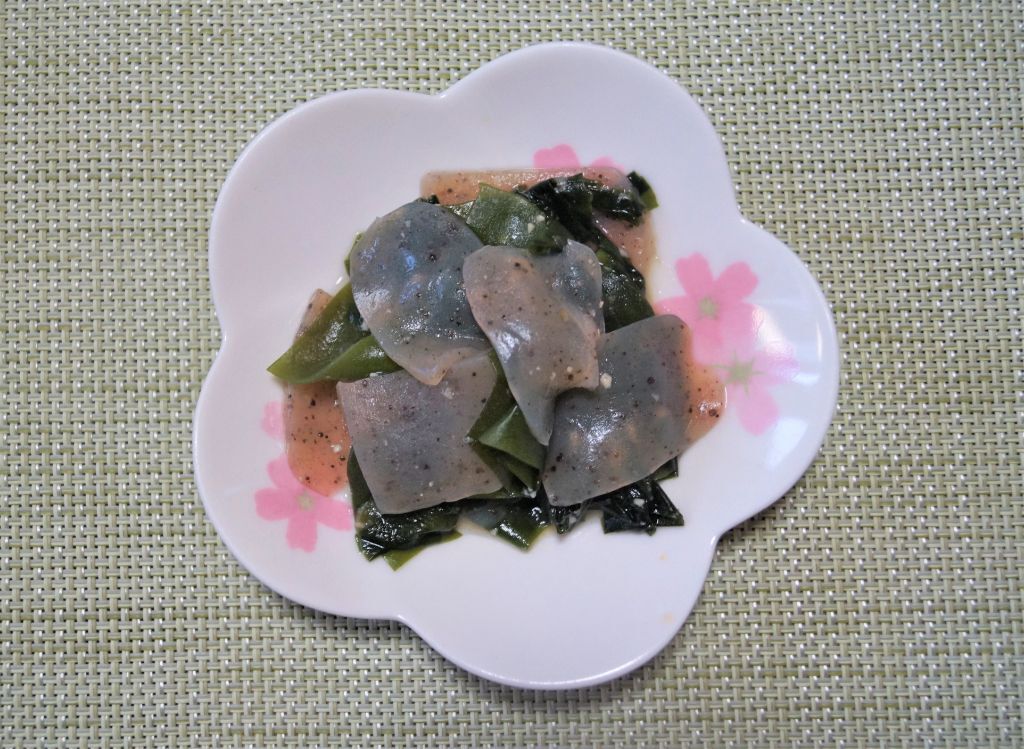 Homeレシピ紹介Yui Clinic 献立わかめとコンニャク味噌和え Categories: Yui Clinic 献立 わかめとコンニャク味噌和え 当クリニックからレシピ紹介 Posted on 2019.12.13 by ゆいクリニック (沖縄市の産婦人科) Tags: こんにゃく ベジタリアン わかめ 砂糖なし わかめとコンニャク味噌和え 材料 (5人分) わかめ(塩蔵) 20g 板こんにゃく 200g 調味料 酢 大さじ1 味噌 大さじ1 ハチミツ 大さじ1 柚子胡椒 お好みで 1調理手順 板こんにゃくは一口大の薄切りにして、塩もみ後茹でる。ワカメは塩抜きし、水気を絞り一口大に切る。 2調理手順 調味料を合わせ①とよく和える。味が馴染んだらお皿に盛り付けて出来上がり。