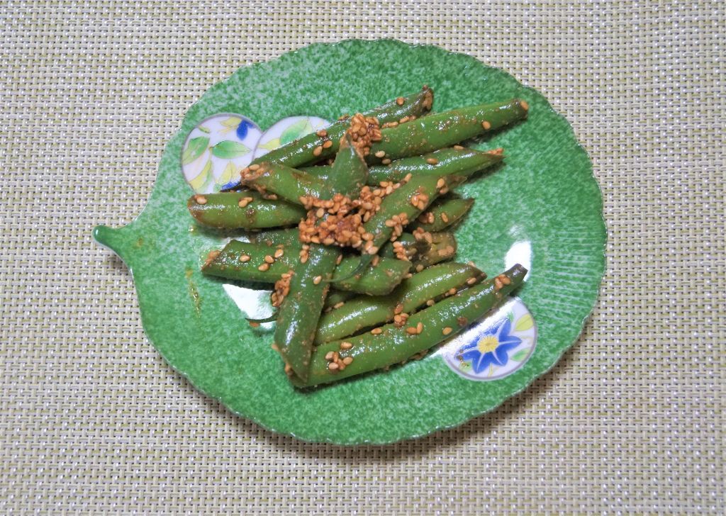 Homeレシピ紹介Yui Clinic 献立インゲンの胡麻和え Categories: Yui Clinic 献立 インゲンの胡麻和え 当クリニックからレシピ紹介 Posted on 2019.12.23 by ゆいクリニック (沖縄市の産婦人科) Tags: さやいんげん ベジタリアン 砂糖なし インゲンの胡麻和え 材料 (5人分) さやいんげん 300g 調味料 しょうゆ 30g いりごま(白) 15g ハチミツ 25g 1調理手順 インゲンはヘタを取り、筋を取ったら軽く茹でる。冷めたら3㎝の長さに切る。 2調理手順 ボウルに①を入れて、しょうゆの1/2量で薄く味付けし、最後に残りのしょうゆ1/3量とハチミツ・いりごまを混ぜ合わせる。冷蔵庫で冷やし味がなじんだら、お皿に盛り付けて出来上がり。