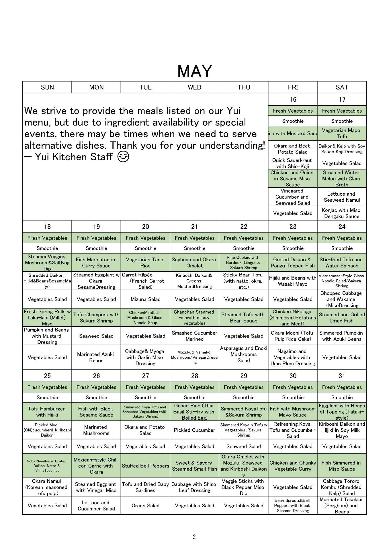 HomeEnglish PageInformationfoodYui Clinic Menu in MAY 2025 Categories: food Yui Clinic Menu in MAY 2025 Information Posted on 2025.5.1 by Yui Clinic (Okinawa, Japan) Tags: casein free gluten free menu non-sugar organic recipe vegitarian on Sunday, we have vegetarian menu.
