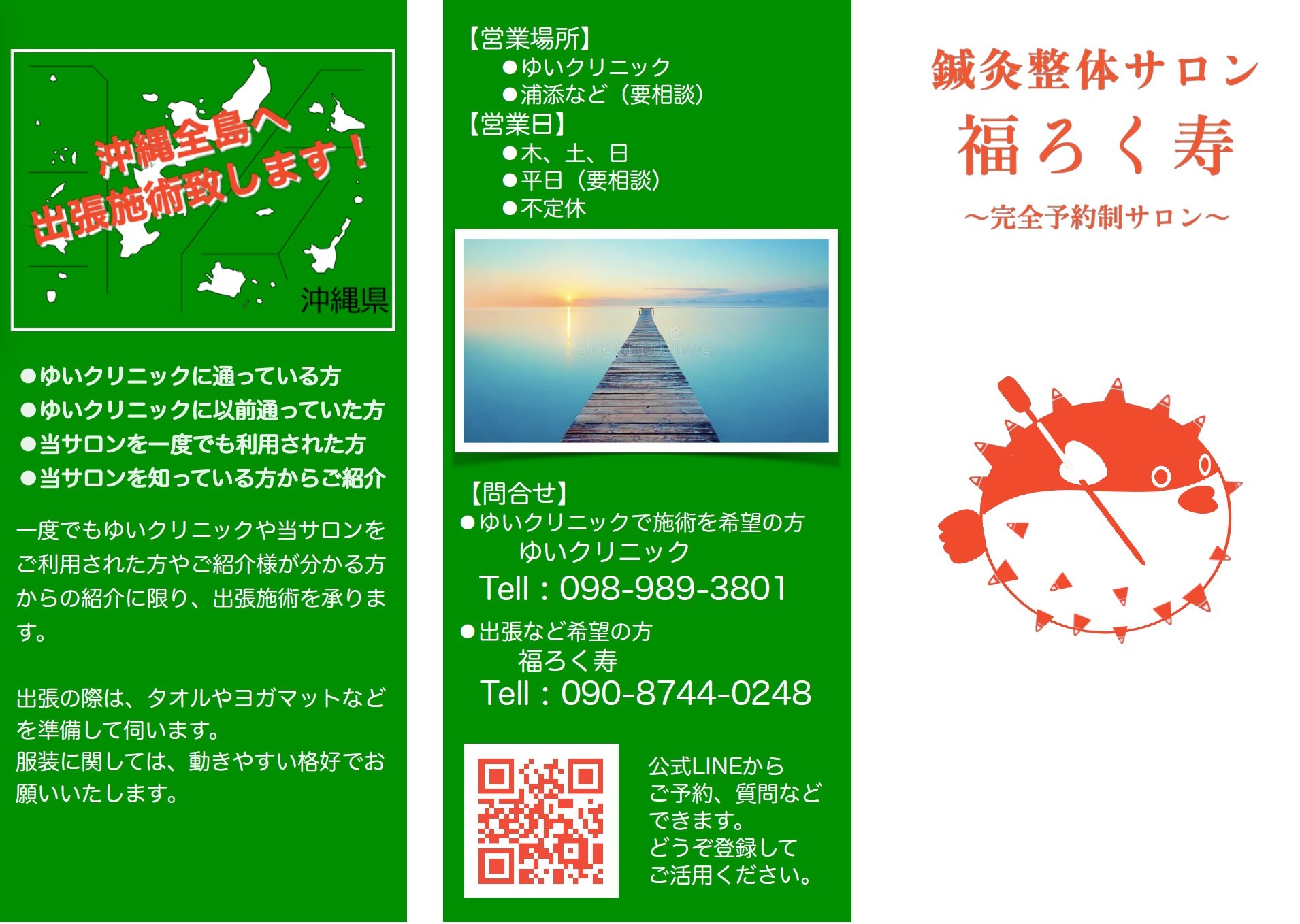 鍼灸整体サロン福ろく寿(整体師:前泊悟さん)ゆいクリニックで施術を受けられます(2024年6月現在)、要予約、料金5500円(約60分)