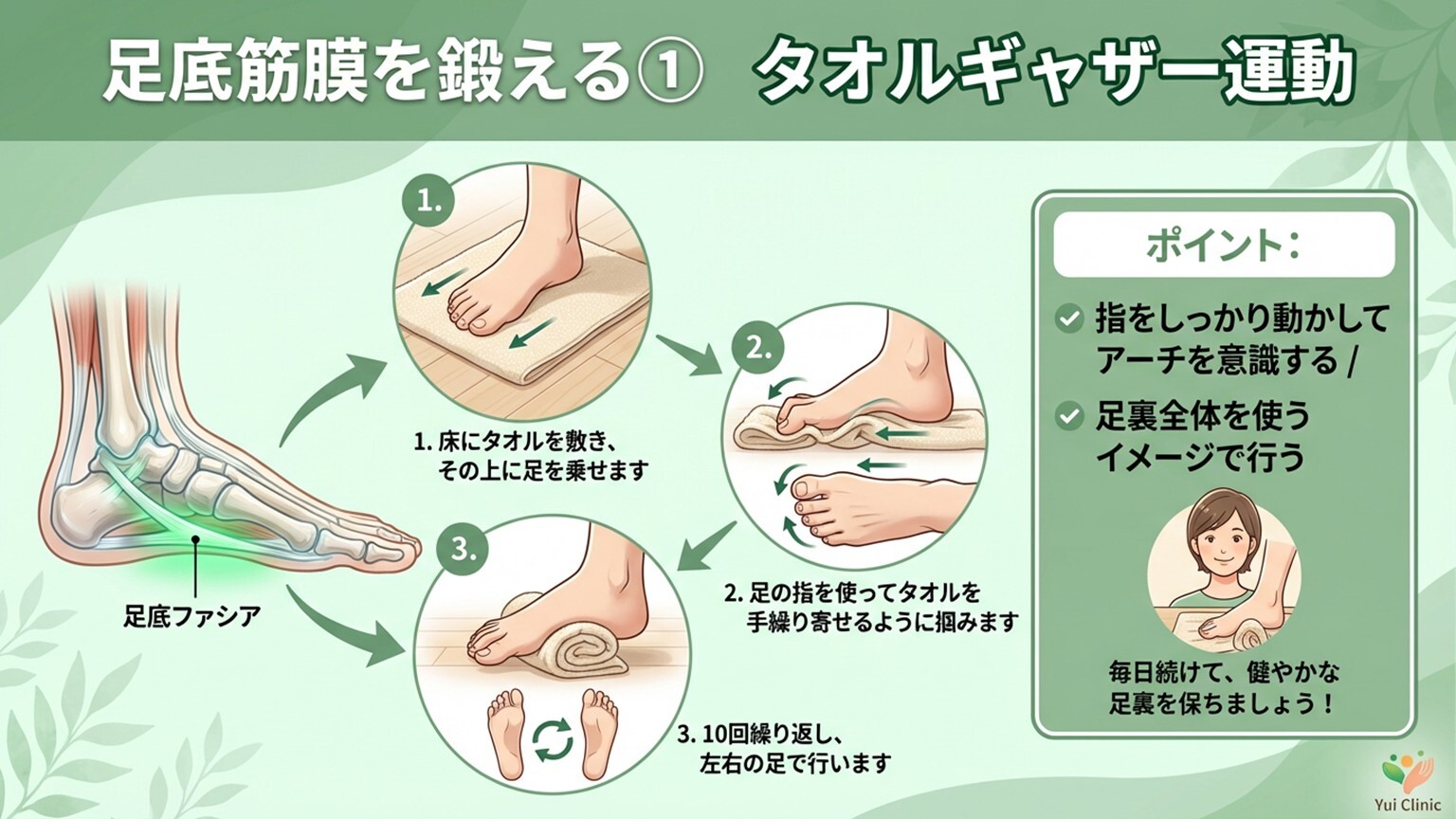 - 足底筋膜が強くなることで、足元の安定感が増し、転倒予防にも効果があります。
