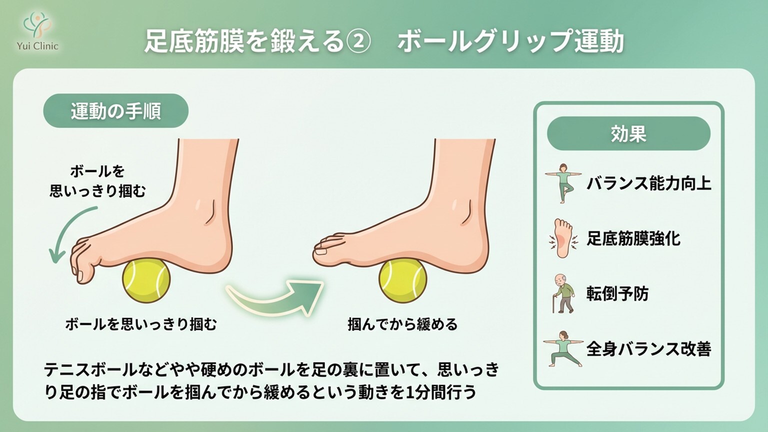 この運動で、足底筋膜が強くなり、バランス能力が向上します。
