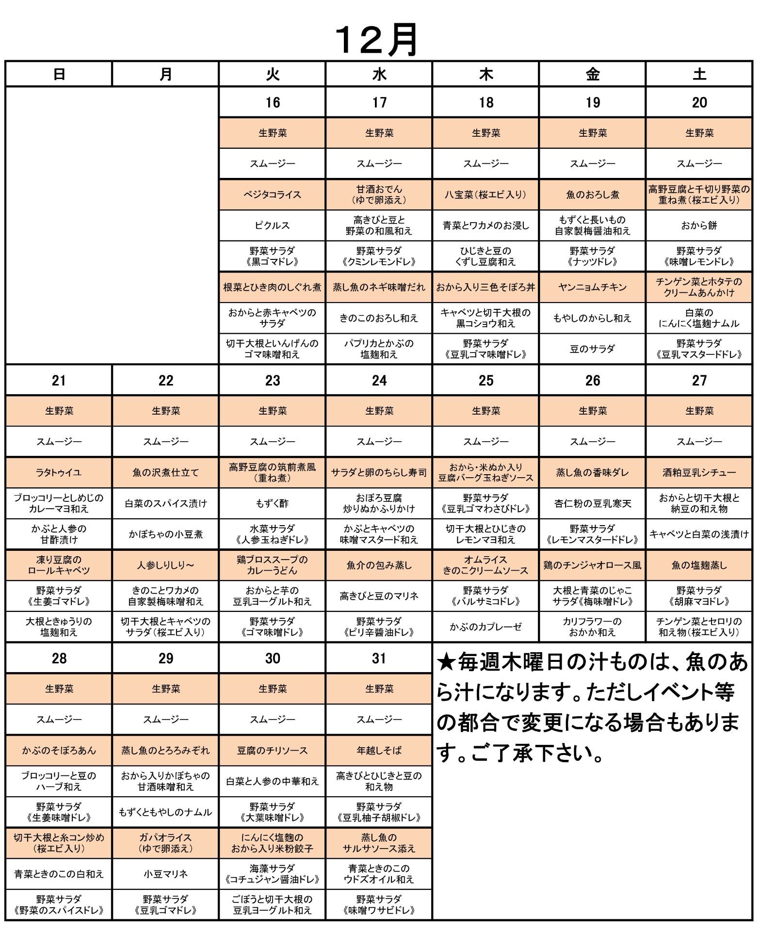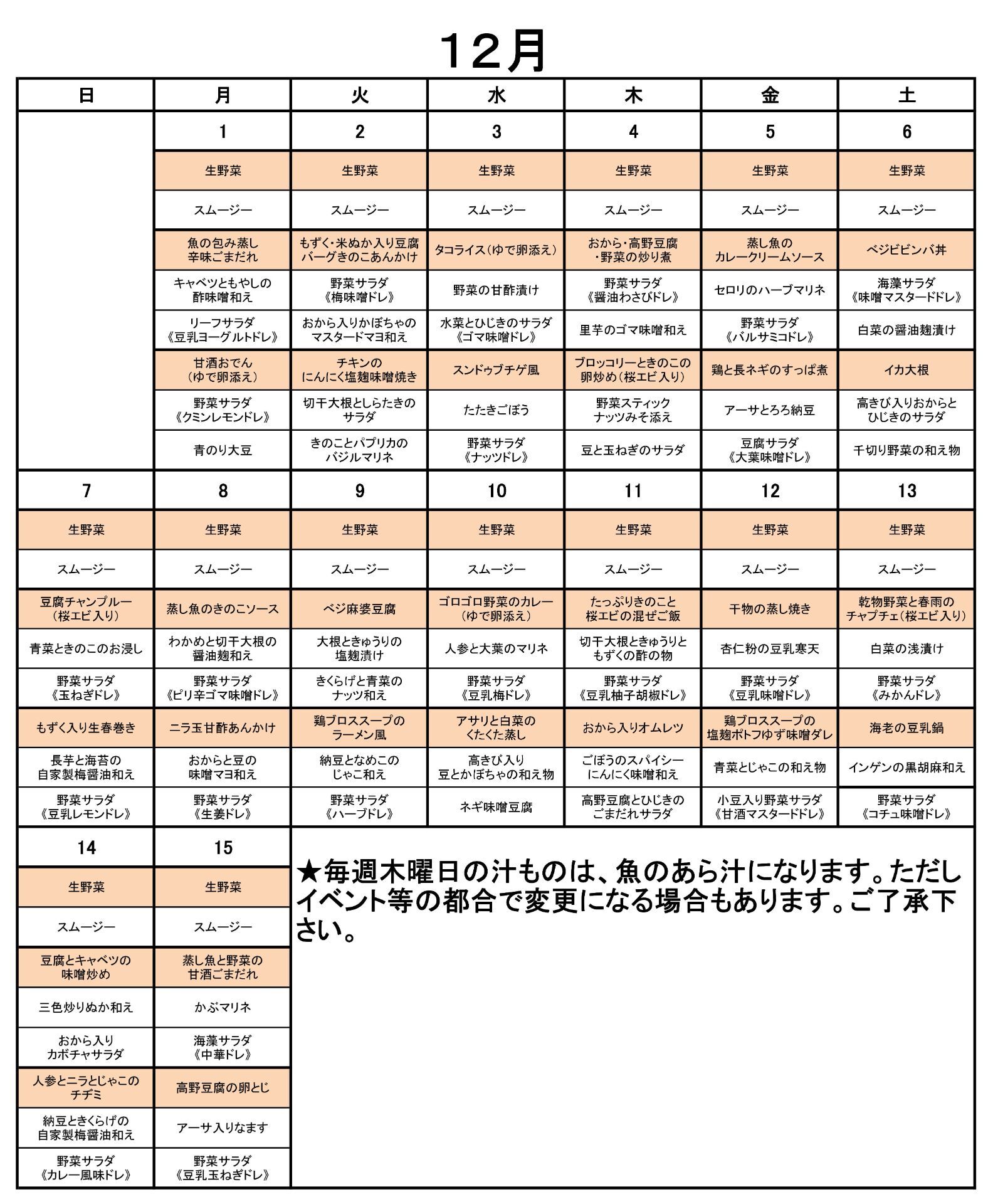 Homeお知らせ・最新情報食事について2025年12月 献立一覧表 Categories: 食事について 2025年12月 献立一覧表 お知らせ・最新情報 Posted on 2025.11.302025.11.13 by ゆいクリニック (沖縄市の産婦人科) Tags: グルテンフリー ビーガン ベジタリアン 乳製品不使用 地産地消 添加物不使用 献立一覧 砂糖不使用 ゆいクリニック厨房より2025年12月の献立メニュー一覧のご紹介です♪ 毎週木曜日には魚のあら汁をご提供! ゲストさんより大変ご好評いただいております♪ レシピもご紹介してます♪