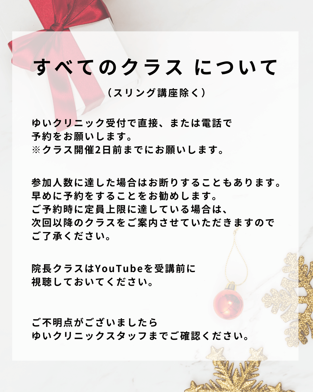 ②参加人数に達した場合はお断りすることもありますので早めに予約をすることをお勧めします。ご予約時に定員上限に達している場合は、次回以降のクラスをご案内させていただきますのでご了承ください。