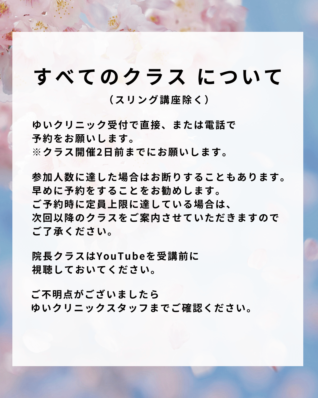 ②参加人数に達した場合はお断りすることもありますので早めに予約をすることをお勧めします。ご予約時に定員上限に達している場合は、次回以降のクラスをご案内させていただきますのでご了承ください。